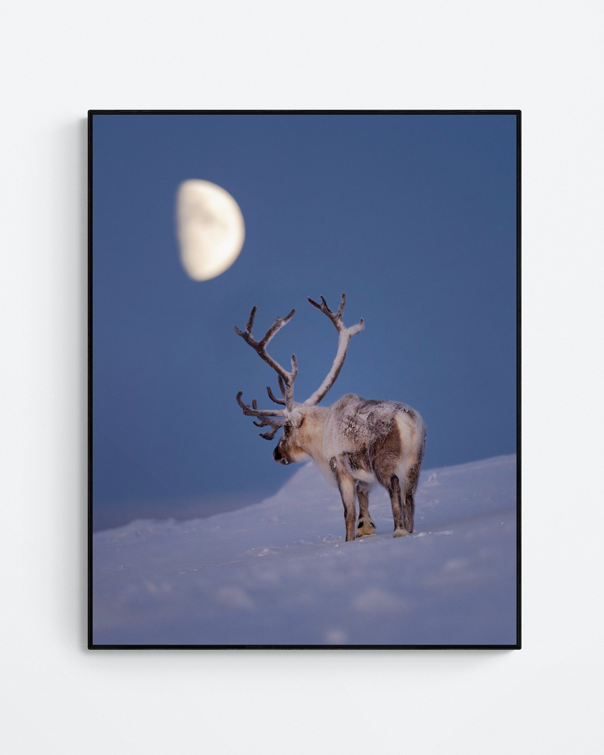Capturing moments like this isn’t easy; it requires a great deal of planning to know exactly when the conditions are right. This photo was taken one hour after sunset, when the orange-red colors had almost completely faded, but there was still a soft light on the horizon that beautifully illuminated the reindeer from the side. The timing with the moon was perfect, so that the moon wasn’t too faint or too bright, forcing me to adjust the exposure differently. Moments like this are my absolute favorite timing when it comes to photographing animals with the moon as a key element.
